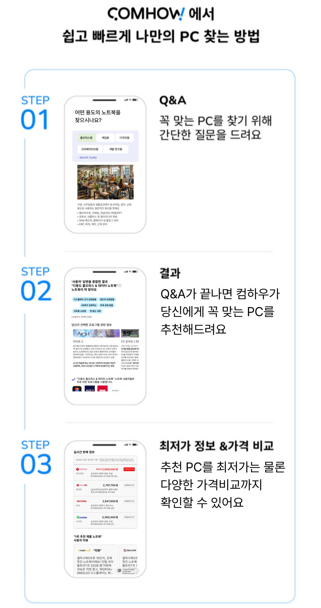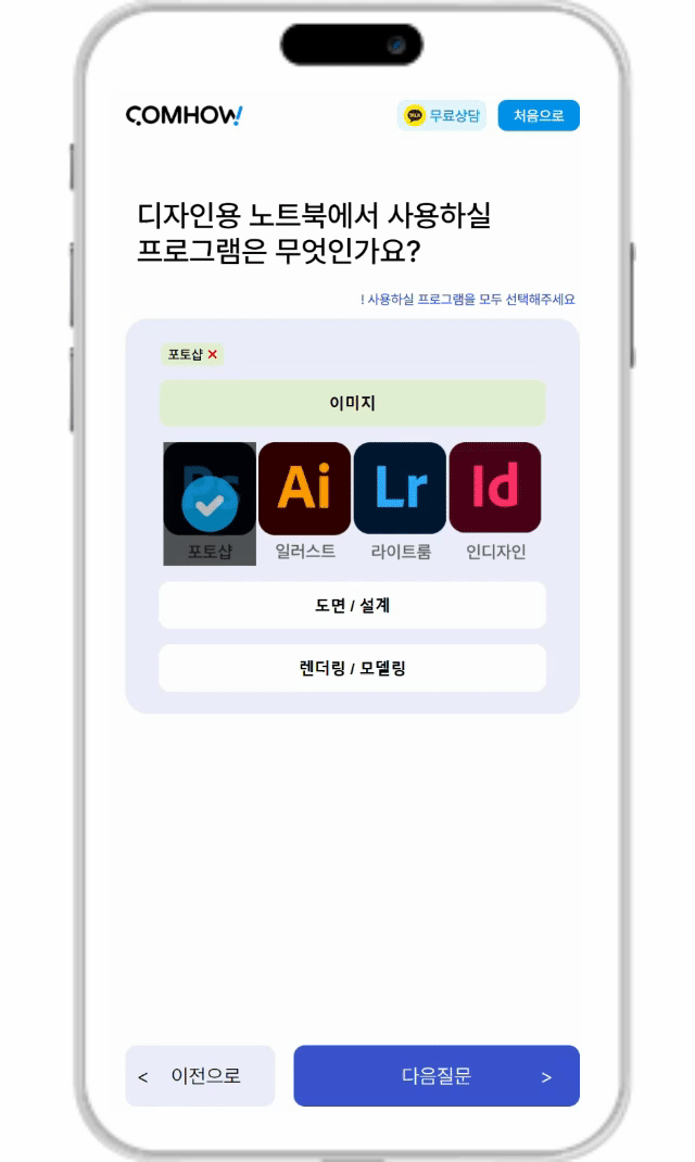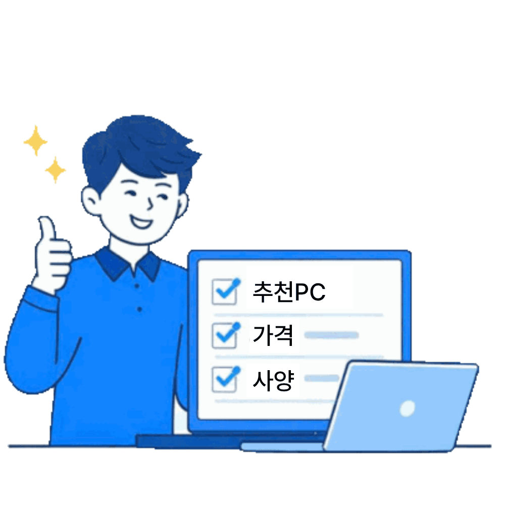 간편한 맞춤 추천: 사양 결정에 꼭 필요한 핵심적인 질의응답(Q&A)만으로 사용자의 용도에 최적화된 컴퓨터를 제안합니다.